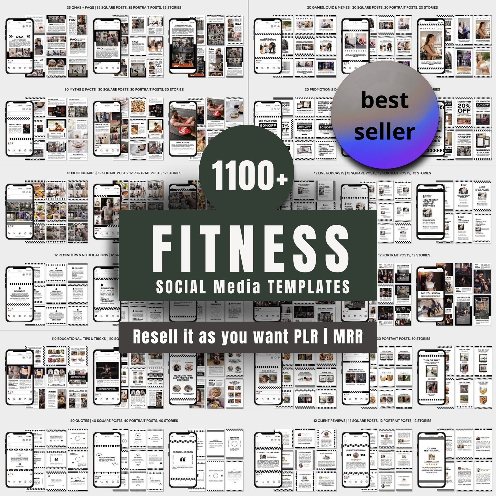 1100+ templates. Every fitness niche. Instagram-ready. Social media-ready. Full resell rights. Instant access.